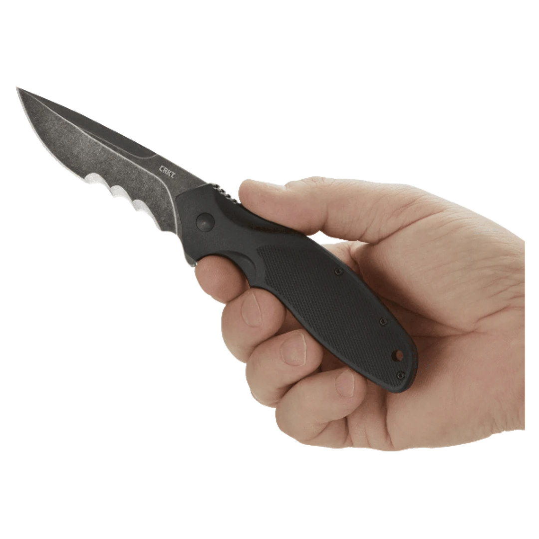 The CRKT Shenanigan Black Veff Serrations Spring Assist Knife is a powerfully durable knife designed by Ken Onion. The black, partially serrated, stonewashed blade, made of 1.4116 steel, breezes through tough materials like rope and cord. This knife features the innovative IKBS ball bearing system for a smooth, quick open every time. This striking blade is a powerful addition to your everyday carry.Â