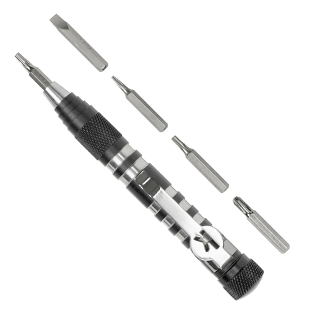 The TX-Tool is our new and improved T-Tool. It includes five key bits for adjusting all your Kershaws: T-6, T-8, and T-10 for most Kershaws, plus the slotted and Phillips® screwdriver bits for the KershawEmersons.