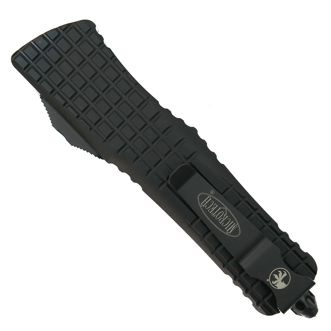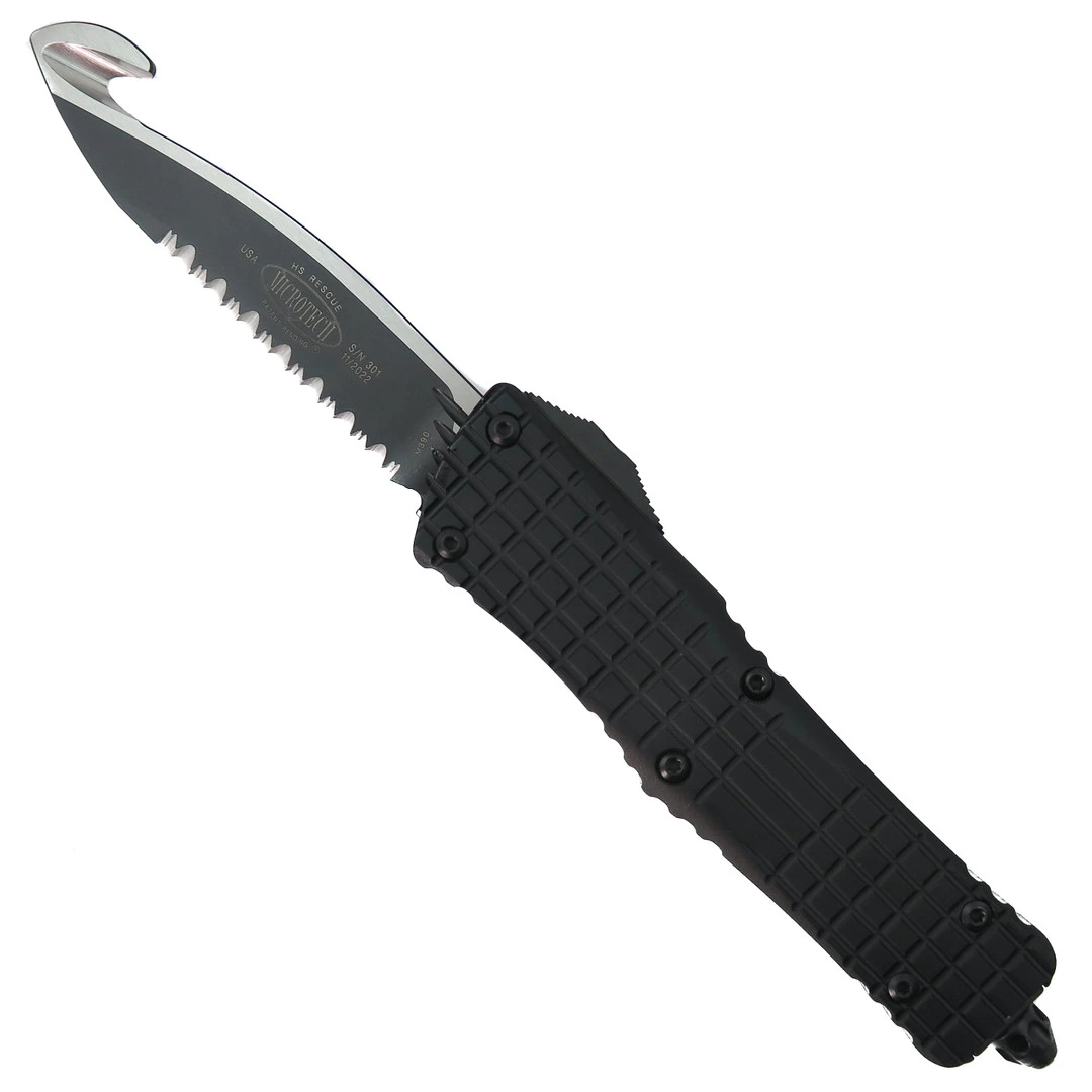This Microtech Rescue Combat Troodon out-the-front knife features a “frag” pattern handle and a fully serrated Rescue blade.