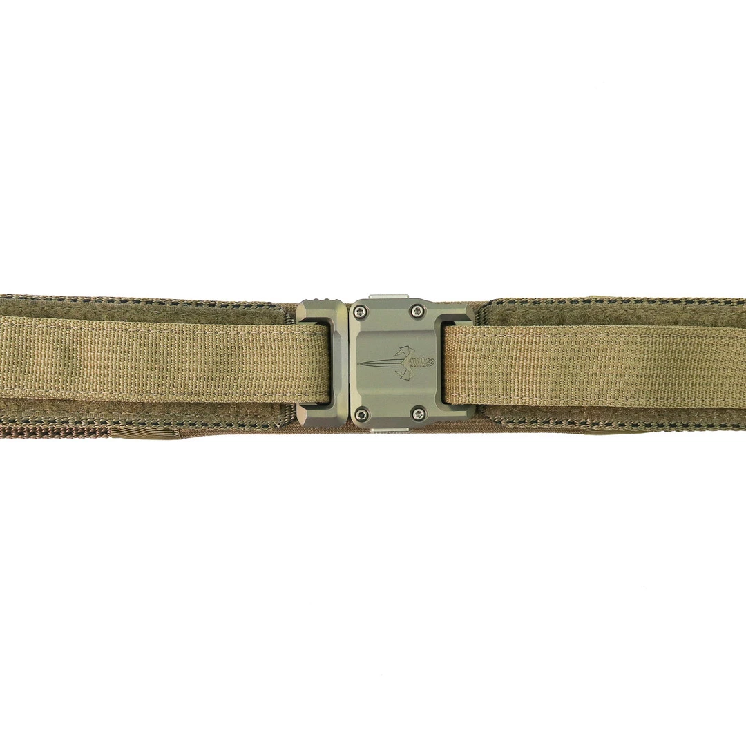 The Microtech Titanium Apis Titanium Belt Buckle with a Coyote Brown Tactical Nylon belt features a nylon belt and a special machined titanium Apis belt buckle