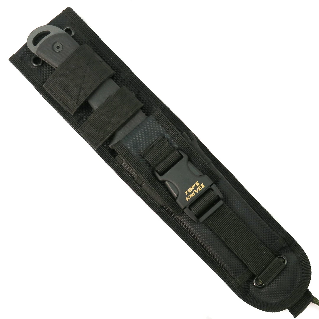 The Air Wolfe pays tribute to the hard working men and women who serve on an air crew. The TOPS Team created this in-house deign to provide the ability to cut straps, rope or even build an emergency shelter. Each full tang designed model sports for thumb jumping and flared handle belly for excellent control while the handle material allows for a no-slip grip even in less-than-ideal conditions. This model features black G-10 handles, a clip point style blade in a tactical grey finish and the black ballistic nylon sheath includes MOLLE backing and provides a belt carry option. Made in the USA.